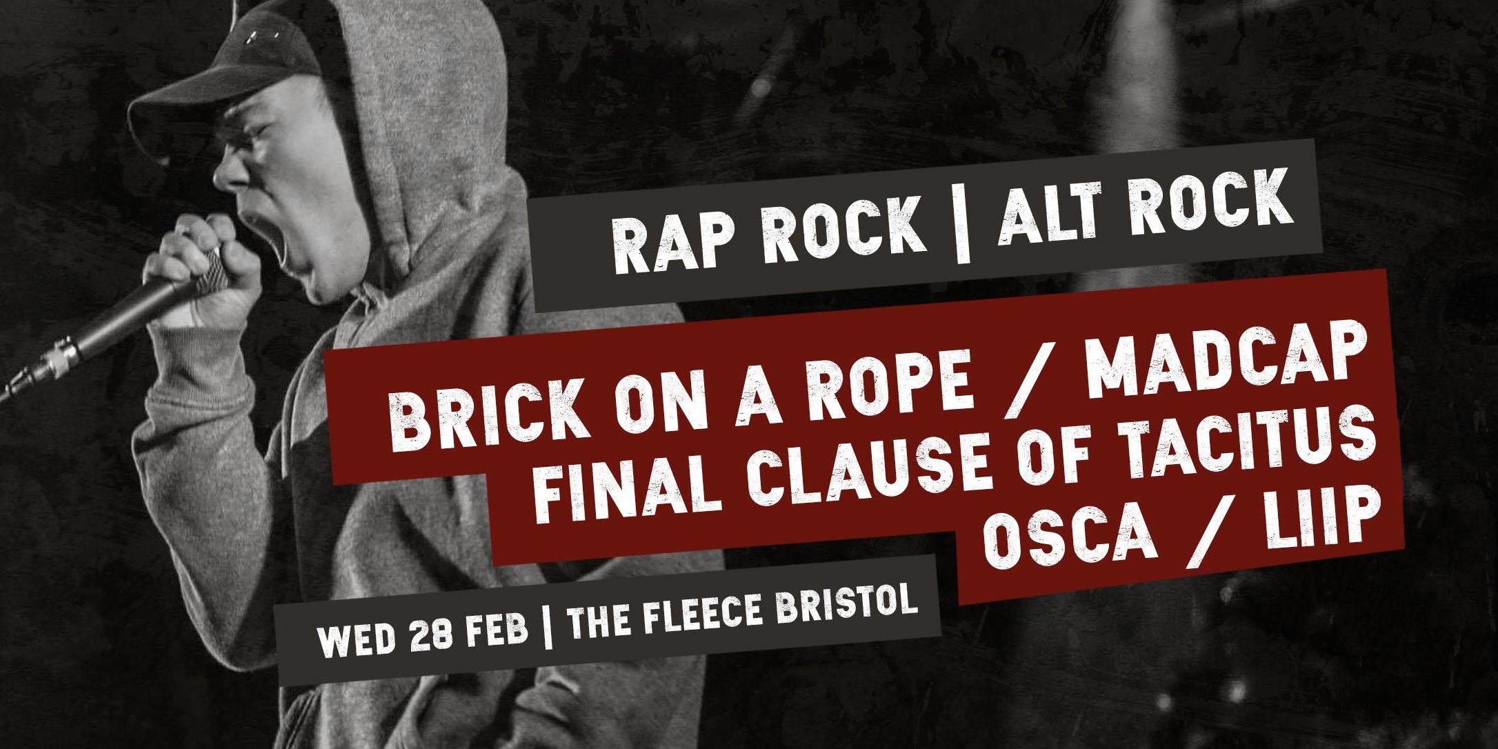 “A Rap-Rock triple bill featuring BRICK ON A ROPE, MADCAP and THE FINAL CLAUSE OF TACITUS, with support from alt rock OSCA and FISH BISCUIT.” – The Fleece